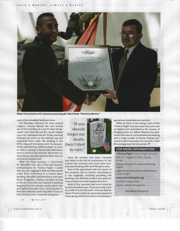 Patrick Hughes is the National Photographer for the Rolling Thunder. He is a member of Post 928 and stops by 3460 now and then. Patrick's big thing is the POW/MIA Program. He travels all over the world setting up The POW/MIA Displays including recently in our Nations Capital Building. He is also involved in bringing our fellow comrades remains home. Patrick was at our Frank Sinatra Show April 7th, and celebrating his daughters who is one of our HA Members, birthday. He gave me the "Never Forgotten" article below that he wrote for the Marine Corps League News. (You can copy and paste it to your computers to better read it) The story was also a documentary on TV recently He was with the group when they went to Tarawa to dig up the remains of Marines from the WWII Battle and bring them home. Patrick also gave us some Tarawa Sand pictured at the left. Semper Fi Patrick